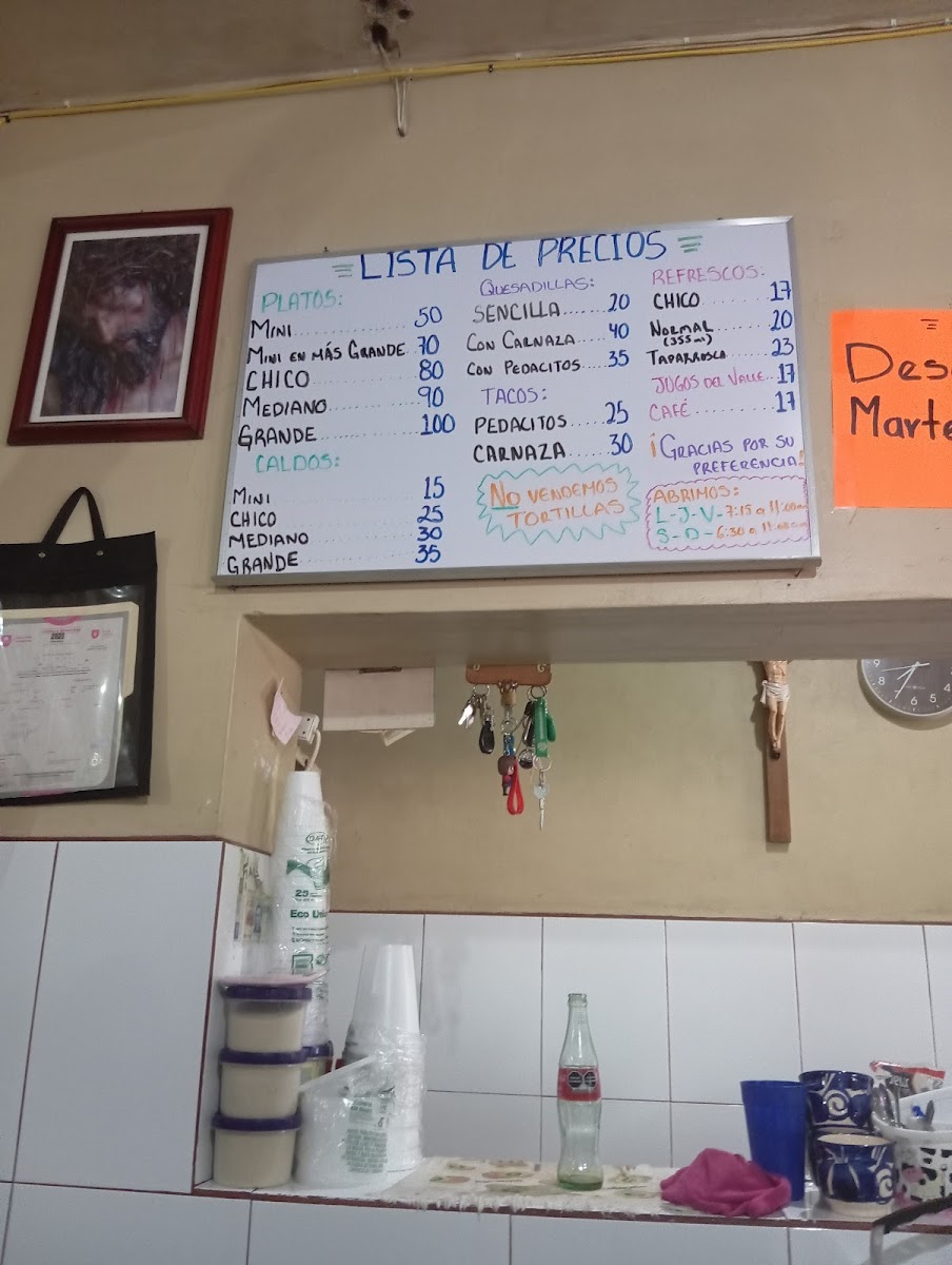 The menu offers a selection of traditional Mexican dishes focused mainly on menudo, a popular regional soup, accompanied by freshly made tortillas and typical condiments. Beverages available include coffee, with Café de Olla mentioned as a highlighted option. The offerings are suitable for breakfast or light meals, with an emphasis on quick service and straightforward dining.
